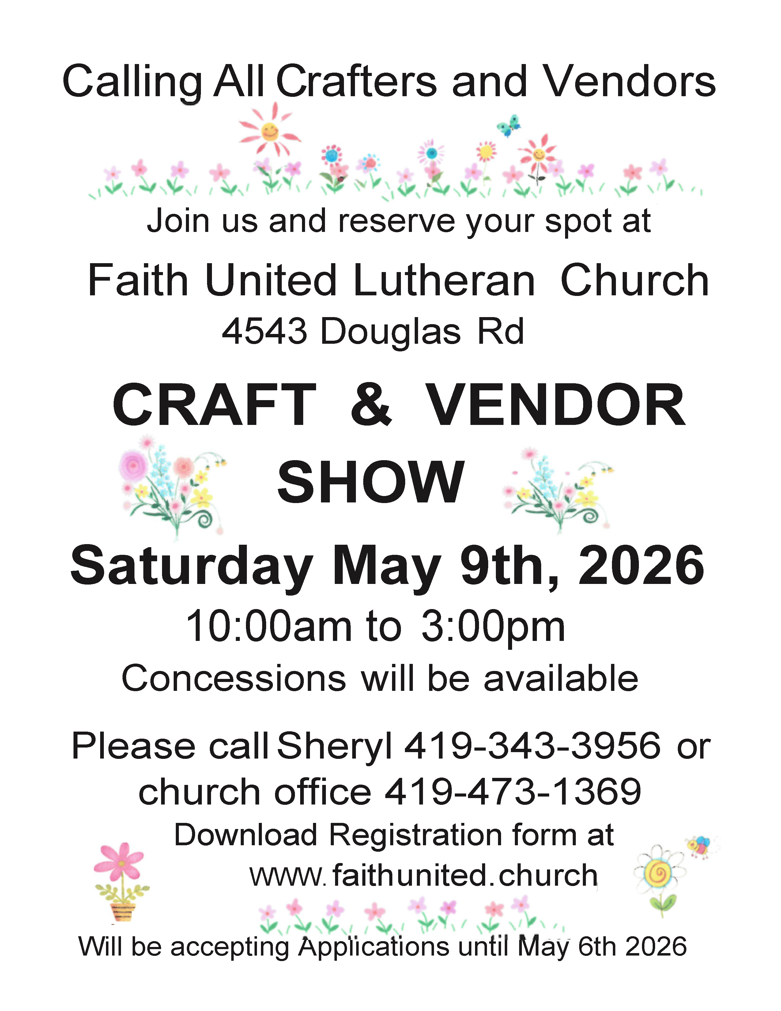 May 9th, 2026 Vendor & Craft Fair Registration This form is solely for the purpose of registering for the Faith United Craft & Vendor Fair, to be held on Saturday, May 9, 2026. You must fill out all required information completely or application will not be accepted. Payment must be made at the time of submission. Payment may be made by PayPal (there is a $1.50 service fee which you must add to your payment), Money Order (made payable to Faith United Lutheran Church, or cash (recommended only for those applying in-person). NO CHECKS WILL BE ACCEPTED. There is a copy of the form at the bottom of this page which you can download, print out, complete, and bring to the church office. Last day forms will be accepted is October 3rd.Name(Required) First Last Address(Required) Street Address City AlabamaAlaskaAmerican SamoaArizonaArkansasCaliforniaColoradoConnecticutDelawareDistrict of ColumbiaFloridaGeorgiaGuamHawaiiIdahoIllinoisIndianaIowaKansasKentuckyLouisianaMaineMarylandMassachusettsMichiganMinnesotaMississippiMissouriMontanaNebraskaNevadaNew HampshireNew JerseyNew MexicoNew YorkNorth CarolinaNorth DakotaNorthern Mariana IslandsOhioOklahomaOregonPennsylvaniaPuerto RicoRhode IslandSouth CarolinaSouth DakotaTennesseeTexasUtahU.S. Virgin IslandsVermontVirginiaWashingtonWest VirginiaWisconsinWyomingArmed Forces AmericasArmed Forces EuropeArmed Forces Pacific State ZIP Code Email(Required) This must be a valid email addressPhone Number(Required)Must be valid numberVendor/Crafter Information(Required)Please give a detailed description of the goods to be sold at the Fair. Be as complete as possible.Special RequirementsWe will attempt to honor everyone's requests.Requirements Wall Space Requested Electrical Access Requested Registration Fees(Required) Price: QuantityAdditional TableRequires an additional space Price: QuantityLate Fee - $5.00(if spaces are available) Price: QuantityPayPal Service Fee - $1.50PayPal payment option below Price: QuantityTotal FeesTotal all fees indicated here Consent(Required) I agree to the items noted below.1. I acknowledge that I have read and understand the Faith United Lutheran Church Building Use and Rule, and I agree to these terms and conditions. 2. Any individual signing and submitting this Registration Form for use of the Faith United facilities hereby agrees to defend, indemnify, and Hold Harmless Faith United Lutheran Church, its staff (paid or unpaid), the Congregational Council Members, or any member of the congregation from liability and claim from damages due to bodily injury, death, property damage, sickness, disease arising from participation in the Craft & Vendor Fair. Failure to agree to this Hold Harmless clause will result in non-approval of registration.Signature(Required)By typing your name in this space, you are acknowledging the above-noted statements throughout this form. You will be asked to sign the document the morning of the event. Date(Required) MM slash DD slash YYYY Payment MethodPayPal CheckoutCredit Card MasterCardVisaSupported Credit Cards: MasterCard, Visa Card Number Expiration Date Security Code Cardholder Name Δ